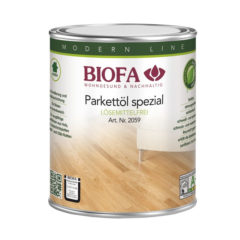 Características: El aceite especial para parquet BIOFA es una ebullición de resina de aceite sin disolvente. Refina permanentemente la madera y crea una superficie resistente. El carácter de la madera natural se revitaliza y le da un brillo aterciopelado. Apto para suelos de madera, OSB esterlina y otros tableros de aglomerado, tableros de fibra y sustratos similares en interiores. Cumple con DIN 53160 (resistencia al sudor y la saliva) y ha sido probado con éxito para un clima interior de baja contaminación. El aceite de parquet especial 2059 se probó para seguridad de deslizamiento y resistencia al deslizamiento de acuerdo con los criterios suizos bfu / EMPA y tiene los siguientes valores GS: caucho liso: GS 2; Goma ranurada fina: GS 2; Plástico acanalado: GS 3; Cuero liso: GS 2. Cumple con los requisitos de la norma de estacionamiento DIN EN 14342 Número de aprobación DIBt: Z-157.10-68
